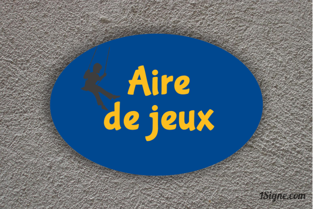 Panneau Aire de jeux, en dérivé de bois compact bleu gravé et peint. Le modèle utilise la forme "ovale". Taille modifiable : Hauteur : 20 cm - Longueur : 30 cm - Matériau choisi : Dérivé de bois compact uni bleu, texte gravé et peint - pictogramme non peint - Epaisseur : 6 mm.