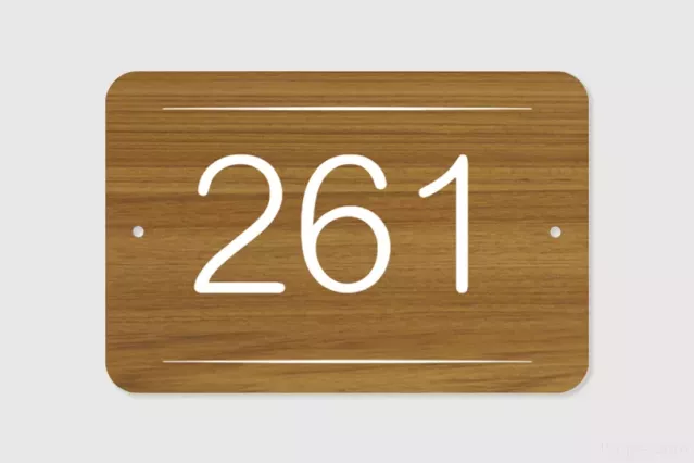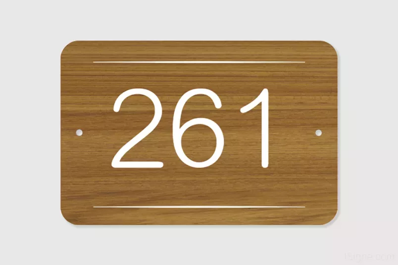 Numéro de maison personnalisé en compact gravé et peint. Le modèle utilise la forme "rectangle arrondi". Taille modifiable : Hauteur : 10 cm - Longueur : 15 cm - Matériau choisi : Compact imitation bois teck, texte peint en blanc - Epaisseur : 6 mm - Fixation : 2 vis horizontales.