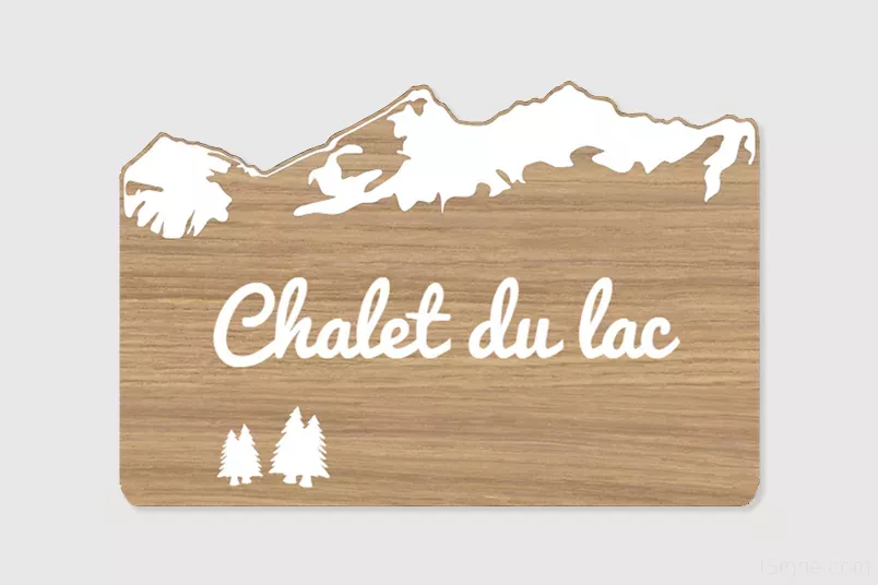 Plaque de maison, en compact gravé et peint. Le modèle utilise la forme "découpe montagne". Taille modifiable : Hauteur : 30 cm - Longueur : 45 cm - Matériau choisi : compact décor bois clair-enigma gravé et peint - Epaisseur : 6 mm.