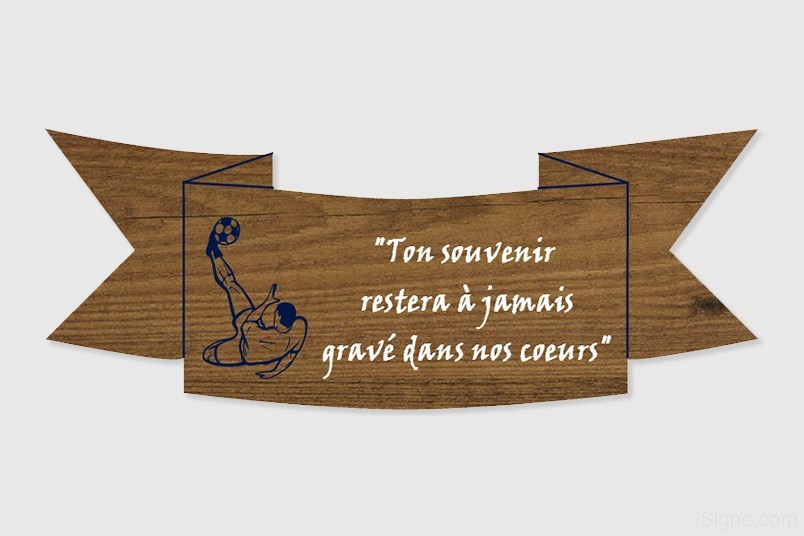 Plaque funéraire, en dérivé de bois compact gravé et peint. Le modèle utilise la forme "banderole". Taille modifiable : Hauteur : 15.6 cm - Largeur : 40.1 cm - Matériau choisi : Dérivé de bois compact imitation bois pin, texte gravé et peint - Epaisseur : 6 mm.
